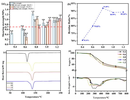 Figure 11c,d depict the thermal performance of the adhesives prepared under different mass ratios. Figure 11c reveals the DSC traces of OSTL adhesives prepared under different mass ratios, complemented by the curing temperature and reaction enthalpy values (Table 7). As the mass ratio increased, the adhesive’s initial temperature of 110.5 °C was the lowest for the ratio 0.6, indicating an unmatured degree of cross-linking and less stable cross-linked network structure within the adhesive. This may correlate with the lower water resistance, consistent with the residual rate results of the adhesive. As the mass ratio continued to increase, especially at a ratio of 0.8, the adhesive exhibited the lowest initial curing temperature and highest enthalpy, indicating the reaction became more favored, leading to a deeper degree of curing. Therefore, at a ratio of 0.8, the adhesive may provide better performance, consistent with the results of the adhesive’s residual hydrolysis rate.