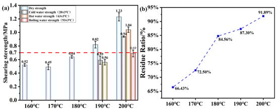 (a) Shear strength of plywood prepared using OSTL adhesives prepared at different hot-pressing temperatures. (b) Hydrolyzed residual rate of OSTL adhesives prepared at different hot-pressing temperatures.