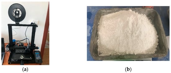 The gypsum used in this study was commercially obtained (ABS Gypsum, İstanbul, Turkiye) and complies with the TS EN 13279-1 standard []. The technical properties of the gypsum are provided in Table 1. Polylactic acid (PLA) filament (Tinylab 3D, İstanbul, Turkiye) was used for the production of the 3D meshes, and its technical properties are presented in Table 2. The 3D printer (Ender-3 V2 model, Shenzhen, China) and the gypsum used in this study are shown in Figure 1.