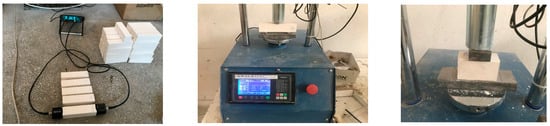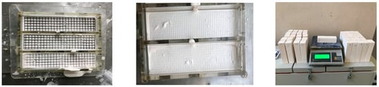 The specimens were demolded after 60 min and stored in laboratory conditions for 7 days. Before testing, they were placed in an oven at 60 °C for 48 h to remove free moisture. Although PLA has a softening point in the range of 60–65 °C, it is important to note that in this study, the meshes were completely embedded within the gypsum composite. Given gypsum’s known fire-resistance and low thermal conductivity, it is unlikely that the PLA meshes experienced critical thermal exposure during the 60 °C curing process. The specimens were then subjected to bulk density testing (ASTM C 138) [], ultrasonic pulse velocity (UPV) testing (ASTM C 597) [], and bending and compressive strength tests (TS EN 196-1) []. Images related to the tests are presented in Figure 2.