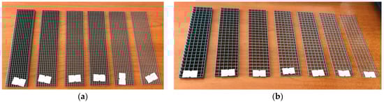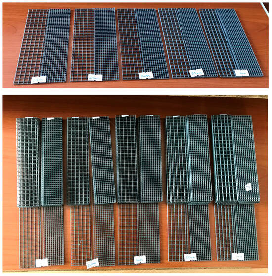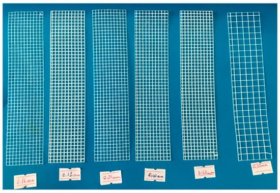In the first trial productions, the low bending strength values, frequent production issues due to the thin fiber thickness, and brittle fractures observed in the matrix due to the inability of the meshes to provide significant reinforcement led to an effort to increase fiber thickness. In this context, the minimum thickness was set at 1.0 mm and the maximum at 5.0 mm, with selected thicknesses of 1.0, 1.5, 2.0, 2.5, 3.0, 4.0, and 5.0 mm. As in the first preliminary trials, the aperture geometries were square, with two different sizes: narrow and wide. To isolate the effect of thickness, all mixtures in this phase used a single-layer mesh. No production defects occurred at these thickness levels. Images of the produced meshes are presented in Figure 9, while the sample codes and characteristics of the specimens are provided in Table 5.