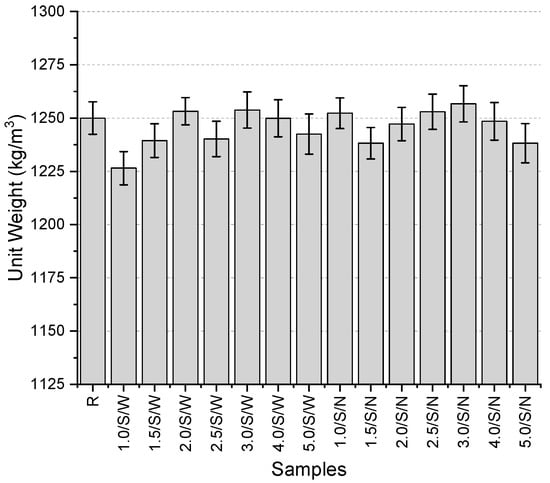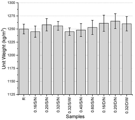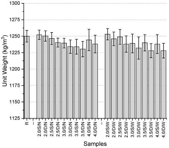 The unit weight values of the specimens (Figure 15) range between 1228 kg/m3 and 1253 kg/m3. The reference specimen has a unit weight of 1250 kg/m3. Among the specimens with a narrow mesh aperture, the highest values were obtained from fibers with a thickness of 2 mm in both single-layer and double-layer mesh configurations (1252.2 kg/m3 and 1250.3 kg/m3, respectively). The lowest values were recorded for the 3.5/S/N specimen in the single-layer configuration (1234 kg/m3) and the 3.5/D/N specimen in the double-layer configuration (1230.4 kg/m3). For specimens incorporating a wide mesh aperture, the highest values were again obtained with fibers of 2 mm thickness in both single-layer and double-layer configurations (1253 kg/m3 and 1246 kg/m3, respectively). The lowest values were observed in the 4.0/S/W specimen for the single-layer configuration and in specimens with 3.5 mm and 4 mm fiber thickness for the double-layer configuration. The maximum decrease compared to the reference was 1.74%, while the maximum increase was 0.24%.