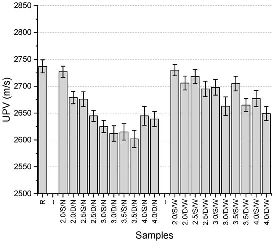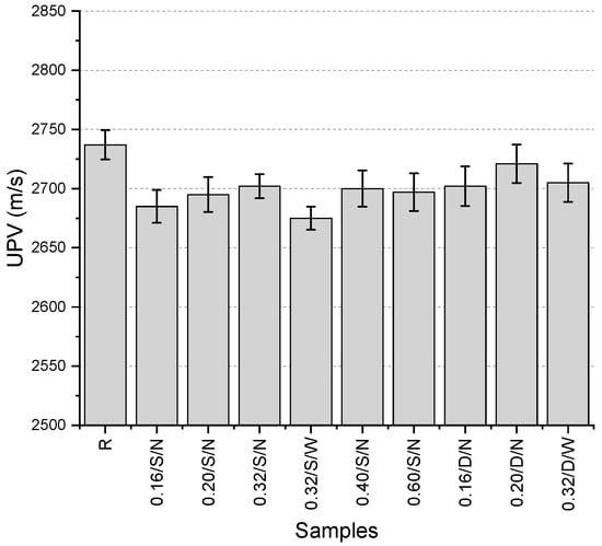 The UPV values (Figure 5) range between 2675 and 2737 m/s, with the highest value obtained from the reference specimen. The UPV test is influenced by voids and cracks within the material structure. A more porous structure or the presence of cracks leads to a decrease in UPV values []. The fact that the highest value was obtained from the reference specimen suggests that minor casting issues may have occurred due to the use of pre-prepared fibers, potentially resulting in slight void formation. The reason for considering the void formation to be minimal is the narrow distribution of UPV values, as the difference between the highest and lowest values is only 2.3%. The lowest value was obtained from the single-layer mesh specimen with a fiber thickness of 0.32 mm and a wide mesh aperture. Among the specimens containing mesh, the highest value was recorded for the 0.20/D/N specimen (2721 m/s). For single-layer mesh specimens, the highest value was observed in the 0.32/S/N specimen. When comparing single-layer and double-layer mesh configurations for the same specimen, the double-layer mesh provided higher results. Additionally, specimens with the same mesh layer and fiber thickness, those with a narrower mesh aperture exhibited slightly higher UPV values.