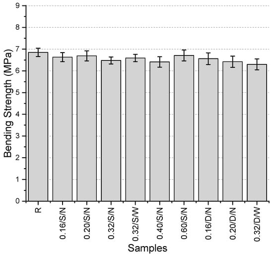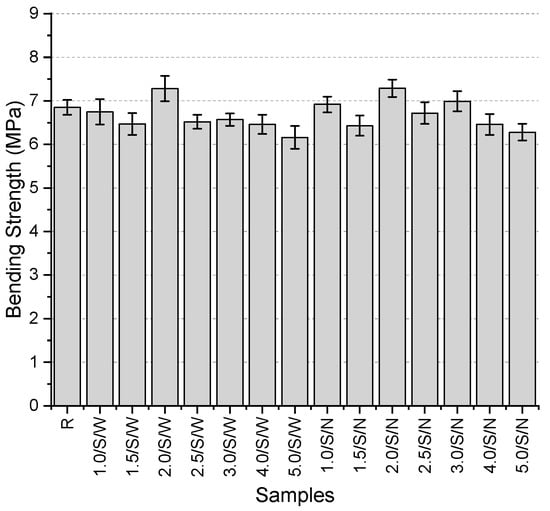 The bending strength of the specimens (Figure 12) ranges from 6.16 to 7.29 MPa. The reference specimen has a bending strength of 6.85 MPa. It was observed that the majority of the specimens exhibited lower bending strength than the reference specimen. The lowest bending strength was recorded in the 5.0/S/W specimen, which showed a 10.1% lower strength compared to the reference. Although the reduction in bending strength across the specimens did not follow a clear trend, the lowest values among both the wide and narrow mesh aperture specimens were obtained from the series incorporating 5 mm thick meshes. However, no direct relationship could be established between the increase in thickness and strength variation. Among the 14 specimens, only 4 exhibited higher strength values than the reference specimen. These were 1.0/S/N, 3.0/S/N, 2.0/S/W, and 2.0/S/N, with respective increases of 1.0%, 2.0%, 6.3%, and 6.4%. It was observed that higher-than-reference strength values were generally obtained with the use of narrow-mesh specimens. The fact that the best values were obtained from specimens with both narrow and wide mesh aperture using 2 mm thick fibers suggests that this thickness might be an optimal value.