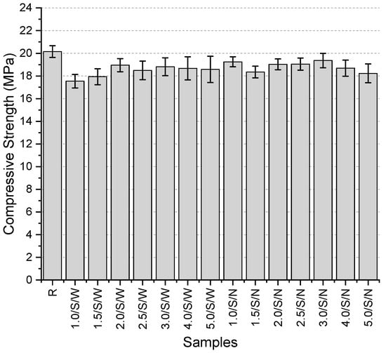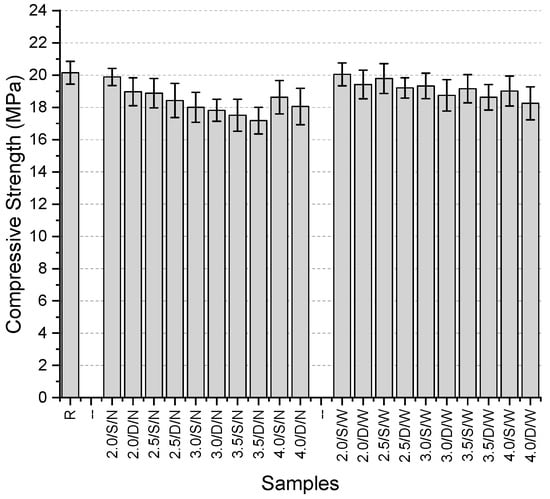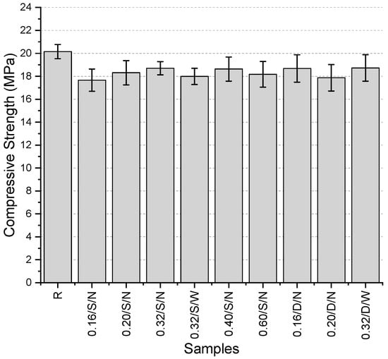 The compressive strength values (Figure 7) of the specimens’ range between 17.7 and 20.2 MPa, with the highest value obtained from the reference specimen. Among the specimens with a single-layer narrow-mesh configuration, the highest compressive strength was recorded in the specimen containing 0.40 mm fibers, with a value of 18.6 MPa. For the specimens containing 0.32 mm thick fibers, where the mesh aperture was varied between narrow and wide, an increase in mesh aperture resulted in a 3.8% reduction in compressive strength. Additionally, in specimens with the same fiber thickness and wide mesh aperture, the use of a double-layer mesh increased compressive strength by 4.1% compared to the single-layer configuration. Among all specimens, the lowest compressive strength was observed in the 0.16/S/N specimen.
