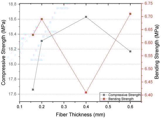 An extended comparison under single-layer, narrow-aperture (S–N) mesh configuration revealed that fiber thickness has a non-linear effect on mechanical properties (Table 4). Compressive strength increased from 17.66 MPa (0.16 mm) to a peak of 18.63 MPa (0.40 mm), but slightly declined at 0.60 mm (18.17 MPa), suggesting a saturation point in reinforcement efficiency (Figure 8). Interestingly, flexural strength showed its maximum at 0.60 mm (6.71 MPa), possibly due to enhanced crack-bridging capabilities with thicker fibers. These results indicate that the optimal fiber thickness may depend on the specific mechanical performance criteria being targeted.
