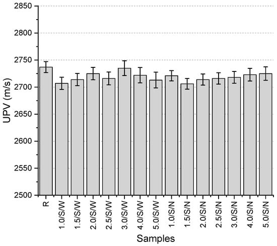 The UPV results (Figure 16) range between 2602 and 2737 m/s, with the highest value obtained from the reference specimen. The use of mesh resulted in a reduction in all UPV values. The maximum decrease was 4.9%, indicating that the variations in UPV values were not significant. Among the specimens incorporating a narrow mesh aperture, the highest value was obtained with the use of a single-layer 2 mm thick mesh. Although the UPV value decreased by 1.8% when the same mesh was used in a double-layer configuration, it still yielded the highest value among the double-layer narrow mesh specimens. The lowest values in this series were observed for the 3.5 mm thick fibers in both single-layer and double-layer configurations (2615 m/s and 2602 m/s, respectively).