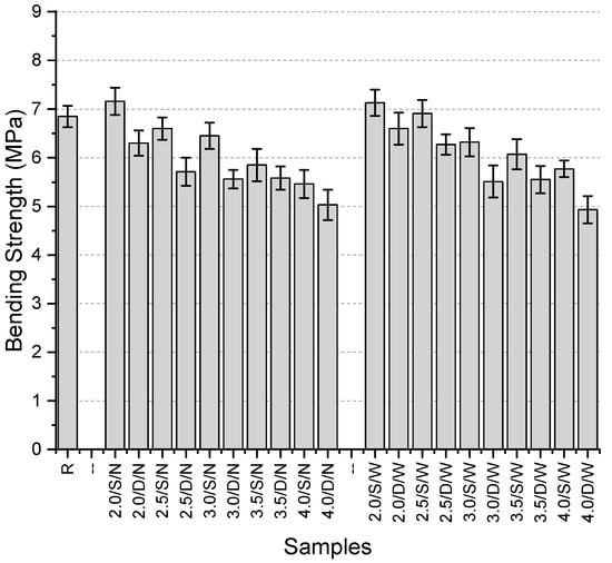 The bending strengths of the specimens (Figure 17) range from 4.93 MPa to 7.16 MPa, with the reference specimen having a strength of 6.85 MPa. The highest bending strength was obtained from the 2.0/S/N specimen. Among the specimens with narrow mesh aperture, the lowest strength was observed in the 4.0/D/N specimen, with a value of 5.03 MPa. Similarly, the lowest strength among single-layer mesh specimens was found in those containing 4 mm thick fibers. In double-layer mesh specimens, the highest value was again obtained with 2 mm thick fibers, consistent with the single-layer results.