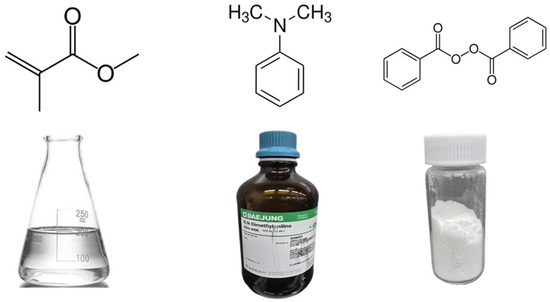 The materials used in this study include methyl methacrylate (MMA), benzoyl peroxide (BPO), and dimethyl aniline (DMA) (Figure 1). MMA was sourced from LX MMA, Seoul, Republic of Korea, while DMA was purchased from Duksan General Science, Ansan, Republic of Korea. All materials were used without further purification. MMA was chosen as the primary monomer for its superior mechanical properties and recyclability potential. BPO served as the curing agent, initiating radical polymerization and significantly affecting both the curing speed and the final resin properties. DMA was utilized as an accelerator to regulate the polymerization reaction between MMA and BPO.