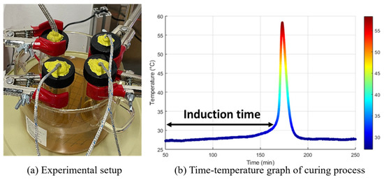 To measure the induction time, this study followed experimental protocols similar to those reported by Suzuki et al. [25] and Gong et al. [26]. Specifically, 10 g of the resin mixture (MMA, BPO, and DMA) was placed into a 20 mL vial, as described in these studies. A hole was drilled into the vial lid, and a K-type thermocouple was inserted to monitor the internal temperature. The lid was sealed with vacuum sealant tape to minimize external temperature interference and environmental influences.