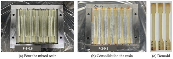 (a) Pour the mixed resin into ISO 527-2 steel mold, after applied release agent. (b) Consolidation at room temperature, followed by post curing (70 °C for 2 h). (c) Demold and sand lightly to make the surface uniform.