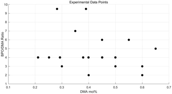 To generate response models for tensile strength and induction time, we selected 18 resin cases by varying the concentrations of benzoyl peroxide (BPO) and dimethylaniline (DMA). Given the chemical importance of their interaction, the BPO/DMA (B/D) ratio and DMA molar content were defined as independent experimental variables. The B/D ratio effectively represents the balance between the initiator and the accelerator, which is critical for understanding curing kinetics. This formulation-based approach enables the analysis of key processing–performance relationships, with relevance to composite manufacturing applications requiring both mechanical performance and process efficiency.