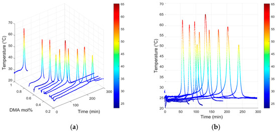 The 3D plot in Figure 5 visually represents the temperature distribution over time for various DMA mol% values. The 2D plot provides a clear visualization of the time interval before the Trommsdorff effect, enabling a detailed analysis of induction time changes. These findings demonstrate that higher DMA concentrations enhance the interaction between the curing agent and the accelerator, thereby accelerating the curing reaction. The experimental results align with theoretical predictions, confirming the validity of the proposed framework.