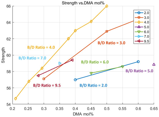 Grouped by B/D ratio, experiment result of strength—DMA mol%.