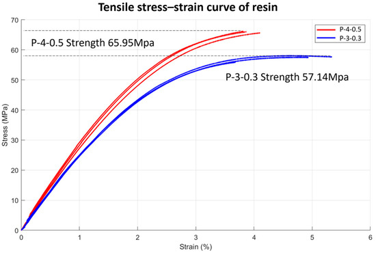 Tensile stress–strain curve of resin, ‘P-4-0.5’ and ‘P-3-0.3’.