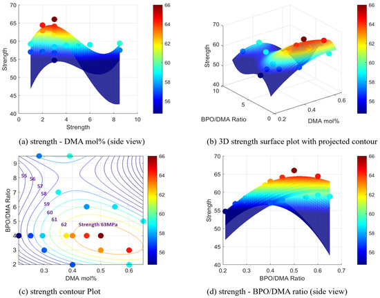 Strength surface and contour plots with experimental points, showing the effects of DMA mol% and B/D ratio: (a) strength—B/D ratio (Side view), (b) 3D strength surface plot with projected contour, (c) strength contour plot, and (d) strength—DMA mol% (side view).