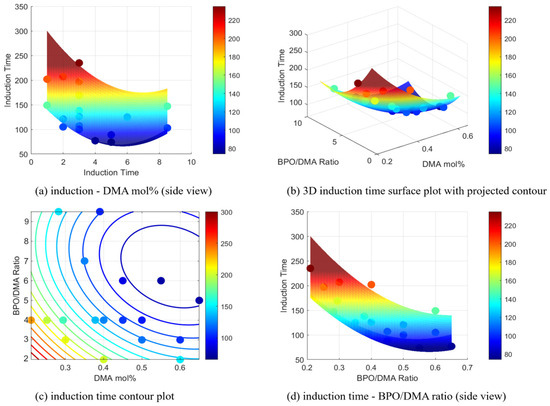 Induction time surface and contour plots with experimental points, showing the effects of DMA mol% and B/D ratio: (a) induction time—B/D ratio (side view), (b) 3D induction time plot with projected contour, (c) induction time contour plot, and (d) induction time—DMA mol% (side view).