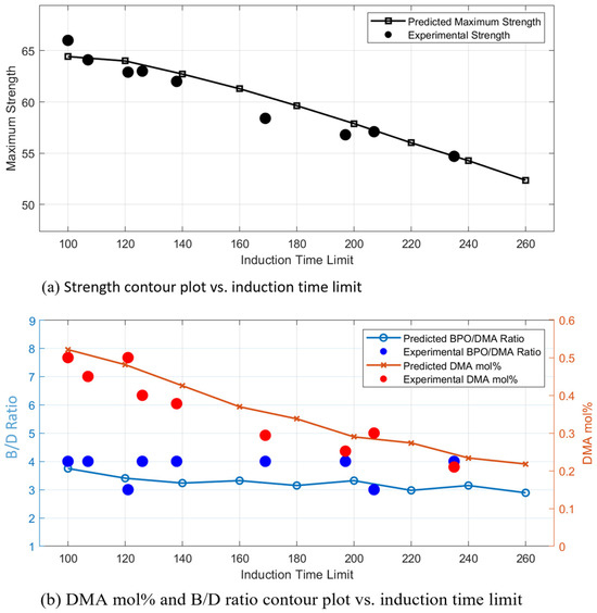 Predicts maximum strength and composition ratios (BPO/DMA ratio, DMA mol%) based on regression models; (a) strength contour plot vs induction time limit; (b) DMA model% and B/D contour plot vs. induction time limit.
