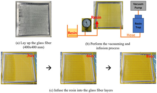 (a) Apply release agent and sealant tape, layup glass fiber, 2-layer 400 × 400 (mm) glass fiber, 0° orientation, OC-L1240. (b) Lay up the infusion consumables, and vacuuming for at least 15 min. (c) Infuse the resin into the glass fiber layers.