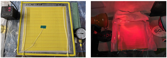 To reduce heat loss during curing, the panels were wrapped in insulating cloth, as illustrated in Figure 14. Temperature measurements were initiated immediately after infusion, with thermocouples placed at the geometric center of each panel to accurately capture the internal thermal response.
