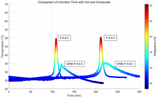 The temperature–time profiles obtained from 10 mL vials and composite panels are compared in Figure 15. Although the maximum temperature observed in the composite panels was lower than that in the vial primarily due to heat loss during curing, the measured ITs were remarkably similar between the two setups.