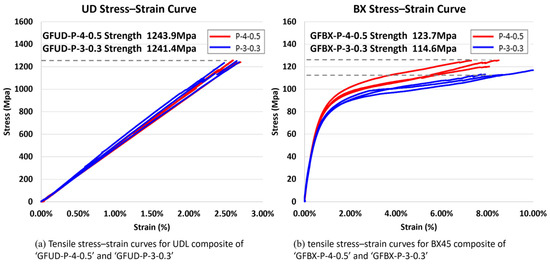 (a) Tensile stress–strain curves for UDL composite of ‘GFUD-P-4-0.5’ and ‘GFUD-P-3-0.3’; (b) tensile stress–strain curves for BX45 composite of ‘GFBX-P-4-0.5’ and ‘GFBX-P-3-0.3’.