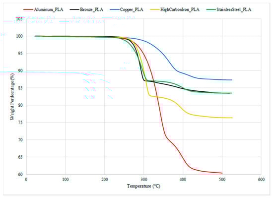 - Ulkir, O. Investigation on the mechanical and thermal properties of metal-PLA composites fabricated by FDM. Rapid Prototyp. J. 2024, 30, 2113–2122. [Google Scholar] [CrossRef]