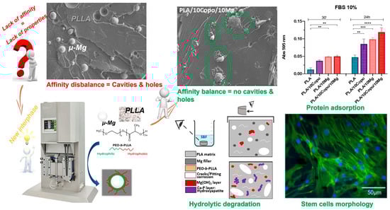 - Abdeljawad, M.B.; Carette, X.; Argentati, C.; Martino, S.; Gonon, M.-F.; Odent, J.; Morena, F.; Mincheva, R.; Raquez, J.-M. Interfacial Compatibilization into PLA/Mg Composites for Improved In Vitro Bioactivity and Stem Cell Adhesion. Molecules 2021, 26, 5944. [Google Scholar] [CrossRef]