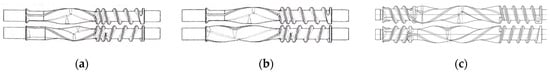 The rotor designs employed in this study are illustrated in Figure 3. The rotor designs included a combination of styles 7 and 15 (15/7 std) and a new high dispersion (HD) rotor (15/7 HD). Additionally, style 15 (15/15) was used as the reference design, as it is the most widely used rotor design. These rotor designs were selected based on their mean residence time and the rise in melt temperatures for HDPE []. The rotor designs that produced the highest and lowest residence time and rise in mixer melt temperature were the styles 15/7 HD and 15/7 std, respectively. The 15/7 std and 15/15 std rotors had two sections: one for conveying and one for melting and mixing. The overall length of these rotors was 205 mm, and the mixing section length was 122 mm. The HD rotor, however, was 328 mm in length and featured a 201 mm long mixing section bracketed by two conveying sections. Melting in the high dispersion (HD) rotors occurs further up-stream than with the standard rotors.
