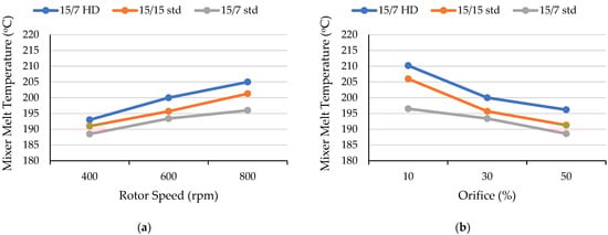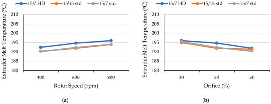 On the other hand, the mixer melt temperature decreased significantly with larger orifice openings (Figure 5b). As the orifice opening increased from 10% to 50%, the mixer temperature decreased from 206 °C to 191 °C for the 15/15 std rotors, 197 °C to 189 °C for the 15/7 std rotors, and from 210 °C to 196 °C for the 15/7 HD rotors. This behavior mainly was attributed to the decreased backflow with larger orifice openings. Although the residence times actually were lower with smaller orifice openings, greater shear heating due to increased backflow reduced the viscosity of the PLA melt. As a result of backflow, the mixer torque increased as the orifice opening decreased. The torque increased from 30% to 59% for the 15/7 std rotor design, 50% to 61% for the 15/15 std rotor design, and 60% to 66% for the 15/7 HD rotor design. As shown in Figure 6, varying the rotor speed and orifice position produced comparable extruder melt temperatures for all rotor designs. The 15/7 HD rotor provided a slight increase in overall extruder melt temperature, but the 15/15 std and 15/7 std rotors exhibited the same melt temperatures. This behavior was attributed to the single-extruder function in the Farrel continuous mixer, which pumps the polymer melt that has already been melted in the mixer section [,].