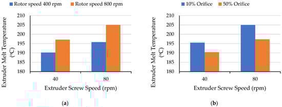 Effect of extruder screw speed on the extruder melt temperature with (a) a variable rotor speed and a constant orifice of 30% and (b) variable orifice and constant rotor speed of 600 rpm.