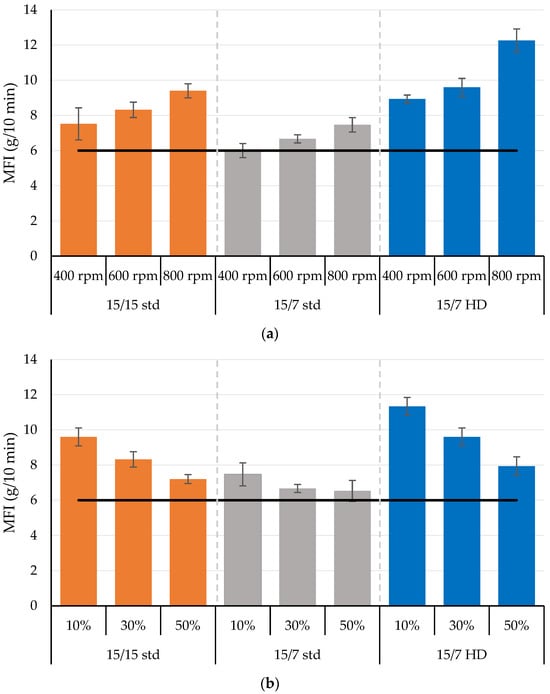 The melt flow index (MFI) is essential for understanding a material’s flowability, as it indicates changes in the polymer’s molecular weight and viscosity. Figure 8a illustrates the effect of rotor speed on the MFI of the processed PLA using different rotor designs. The MFI increased significantly with higher rotor speeds, indicating reductions in melt viscosity. Higher rotor speeds generate greater shear, leading to increased viscous dissipation, which reduces melt viscosity and can induce chain scission reactions in the processed PLA. These trends were consistent with increases in screw speed when processing PLA using twin-screw extruders [,]. For 15/15 std, 15/7 std., and 15/7 HD, the melt index increased linearly with increasing rotor speed at rates of 0.0047, 0.0038, and 0.0084 g/10 min per rpm, respectively; the corresponding coefficients of determination (r2) were 0.99, 0.99, and 0.89.