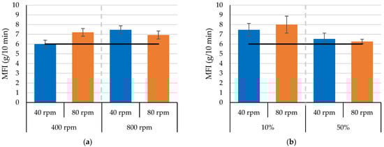 Increasing the screw speed at a higher rotor speed (800 rpm), however, produced a marginal decrease in the MFI of the processed PLA (Figure 9a). The MFI decreased from 7.5 g/10 min to 6.9 g/10 min when the screw speed increased from 40 rpm to 80 rpm. Similarly, with a larger orifice opening (50%), the MFI decreased from 6.7 g/10 min to 6.2 g/10 min with an increase in screw speed from 40 rpm to 80 rpm (Figure 9b). The overall impact of screw speed on MFI was minimal compared to rotor speed and orifice positions. These results also suggest that the screw speed could help to minimize the PLA degradation; however, it varies according to the mixer section conditions (i.e., rotor speed and orifice position). Further study could provide a greater understanding of the interaction of the mixing section and the extruder section on the degradation of PLA.