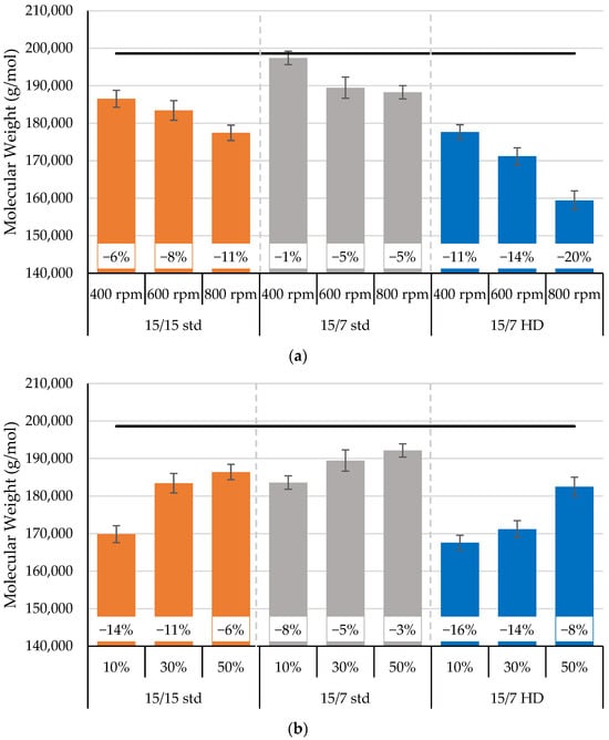 The molecular weight was also affected by orifice position (Figure 10b), with smaller openings producing greater reductions in molecular weight. For instance, when using the 15/7 HD rotors, the molecular weight decreased by 8% to 16% when the orifice opening decreased from 50% to 10%, respectively. The 15/15 std exhibited weight reductions of 6% to 14% for the same decrease in orifice opening. In contrast, the 15/7 std rotor design produced minimal molecular weight reduction of 3% to 8%—i.e., it showed minimal thermomechanical degradation and the highest retention of molecular weight. Smaller orifice openings allow greater backflow. Based on these results, the 15/7 HD and 15/15 std rotor designs were far more aggressive, as they produced more significant reductions in molecular weight.
