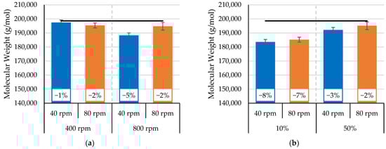 Since the melt flow index data indicated changes in molecular weight, the parallel-plate rheometer was used to determine the zero-shear viscosity. The molecular weights calculated from the zero-shear viscosities for the processed and unprocessed PLA are presented in Figure 10; the zero-shear viscosities are shown in Table S1. After processing at steady-state conditions, the molecular weight decreased with higher rotor speeds and decreasing orifice openings. These results followed the same trend as the melt flow index results. The unprocessed PLA had a molecular weight of 198,632 g/mol. With rotor speeds of 400 rpm to 800 rpm, the molecular weight decreased after processing by 11% to 20% for 15/7 HD rotors, by 6% to 11% for the 15/15 std rotors, and by 1% to 5% for the 15/7 std rotors. The reduction in molecular weight with increasing screw speed has been reported by many research groups when using twin-screw extruders [,,,]. The reduction in molecular weight was attributed to the effect of shearing on polymer melt caused a thermomechanical degradation. Conversely, Aldhafeeri et al. [] reported an increase in molecular weight when increasing screw speed from 400 to 1000 rpm due to the longer residence time at lower screw speeds when using twin- and quad-screw extruders.
