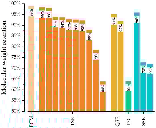 Molecular weight retention of processed PLA using Farrel continuous mixer (FCM), co-rotating twin-screw extruder (TSE) [,,,,,,,,], quad-screw extruder (QSE) [], counter-rotating twin-screw extruder (TSC) [], and single-screw extruders (SSE) [,,].
