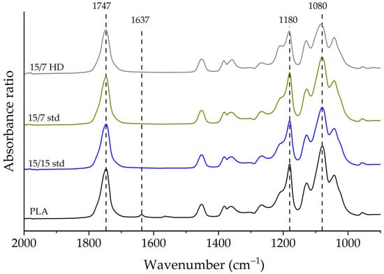 After processing PLA, the peak at 3100–3750 cm−1 (O-H groups) remained unchanged, indicating no degradation due to hydrolysis. Since higher rotor speeds caused a significant reduction in molecular weight, Figure 13 displays the FTIR spectra for the PLA processed using different rotor designs at a rotor speed of 800 rpm. The most noticeable changes were at 1080, 1180, and 1750 cm−1. These changes in the intensities were associated with thermomechanical degradation resulting in random PLA chain scission when varying rotor speed, orifice position, and rotor designs [,,,]. In addition, with the 15/7 HD rotor design, a new peak was observed at 1250 cm−1; it corresponded to the C–O stretching vibration of the ester group. Moreover, after processing, the peak at 1630 cm−1 (corresponding to H-O-H bending vibrations) was not visible in the infrared spectra. The absence of this peak could indicate the occurrence of thermal chain scission at the C-O bond [,] or the presence of water molecules in unprocessed PLA [].