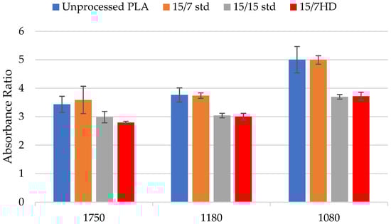 Absorbance ratio for the peaks at 1080, 1180, and 1750 cm−1 for unprocessed PLA and PLA processed using different rotor designs at a rotor speed of 800 rpm and orifice position of 30%.