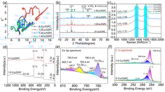 (a) Cole-Cole diagram of the Co/SSPC composite; (b) XRD and (c) Raman spectra of the Co/SSPC composite; (d) XPS survey spectrum of 0 Co/SSPC and 1.0 Co/SSPC; (e,f) high-resolution spectra of (e) Co 2p and (f) C 1s.