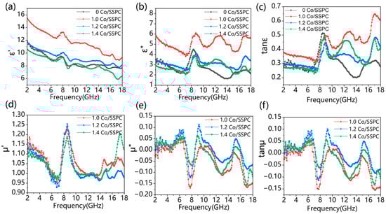 As depicted in Figure 4, the magnetic permeability curves of 1.0 Co/SSPC, 1.2 Co/SSPC, and 1.4 Co/SSPC are intertwined, suggesting comparable magnetic losses among these samples. The primary factor contributing to the variation in microwave-absorption performance is likely the dielectric constant. As shown in Figure 4a, the real part of the dielectric constant decreases with an increase in frequency. This decrease may be attributed to the fact that the introduction of Co has altered the impedance matching of the material. In Figure 4b, the imaginary part of the dielectric constant experiences a sudden increase around 8, 13, and 17 GHz. This phenomenon could be due to the material’s polarization mechanism being unable to keep pace with the rapid changes in the electric field. Consequently, this also leads to a sudden increase in the curve in Figure 4c at 8, 13, and 17 GHz. The magnetic loss of Co-free SSPC is zero. However, the addition of cobalt imparts a certain degree of magnetic loss to the Co doped SSPC. According to Debye relaxation theory, the relationship between and can be explained by [36,43,44]: