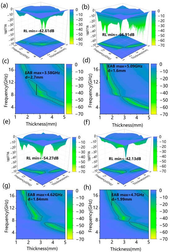 The reflection loss 3D map of (a) 0 Co/SSPC, (b) 1.0 Co/SSPC, (e) 1.2 Co/SSPC, and (f) 1.4 Co/SSPC; the effective absorption band 2D map of (c) 0 Co/SSPC, (d) 1.0 Co/SSPC, (g) 1.2 Co/SSPC, and (h) 1.4 Co/SSPC.