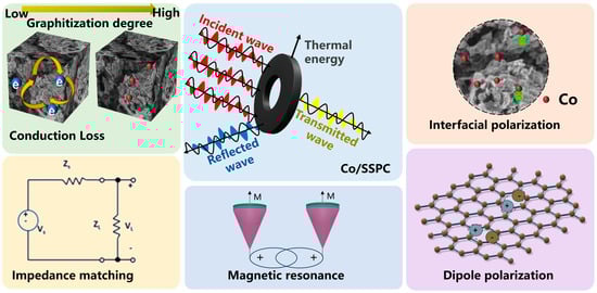 Furthermore, based on the above-mentioned experimental results, the possible microwave-absorbing mechanism of Co/SSPC was proposed, as shown in Figure 7. Firstly, the impedance characteristics of Co/SSPC are determined by its composition and microstructures. When an incident electromagnetic wave impinges upon the material surface, only a fraction of the electromagnetic wave is reflected, while another portion of the wave can penetrate the material unhindered for absorption [58]. Within the material, there exist numerous micro-scale inhomogeneous structures. These structures cause the electromagnetic wave to undergo multiple reflections and attenuation processes within the material [59].
