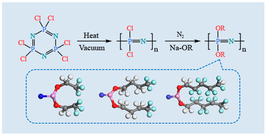 The synthesis of the POP was carried out according to the procedure described in the reference [29]. Pure Hexachlorocyclotriphosphazene (HCCP) was ring-opened polymerized to produce the intermediate PDCP. Subsequently, pre-prepared sodium trifluorobutyl was added dropwise to the solution of PDCP in anhydrous tetrahydrofuran (THF), and the reaction was allowed to proceed for 48 h. Finally, pure PTFBP was obtained following purification steps. PTFEP and POFPP were synthesized using the same process. The detailed synthesis process is illustrated in Figure 1.