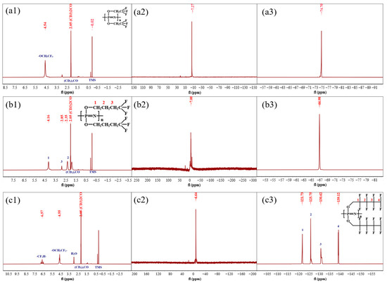 (a1,c1) 1H NMR; (a2,c2) 31P NMR; (a3,c3) 19F NMR spectra; (a) PTFEP/PVDF; (b) PTFBP/PVDF; (c) POFPP/PVDF.