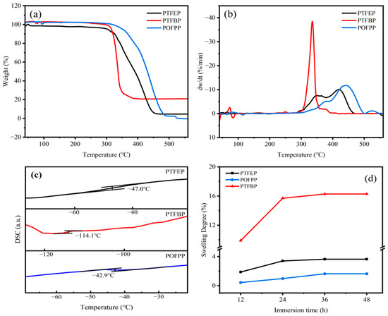The Tg of POP polymers was determined and is presented in Figure 4c. Specifically, the Tg values for PTFEP, PTFBP, and POFPP are −47.0 °C, −114.1 °C, and −42.9 °C, respectively. The Tg values follow the order of PTFBP < PTFEP < POFPP. It is important to note that the lower Tg values generally indicate enhanced mobility of molecular chain segments, leading to improved permeability of membranes.