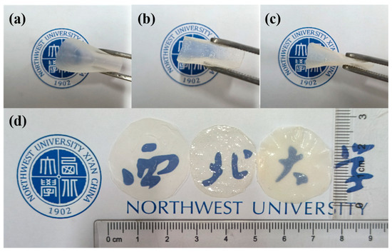 The morphology photographs of homogeneous membranes were taken using a camera, as depicted in Figure 5. Figure 5a–c displays the morphologies of homogeneous membranes made of PTFEP, PTFBP, and POFPP, respectively. It is evident that the homogeneous membranes are colorless and transparent with excellent flexibility. The diameter of these homogeneous membranes falls within the range of 2.5 cm to 3 cm, as illustrated in Figure 5d. From the morphology image of the homogeneous membranes, it is discernible that PTFEP, PTFBP, and POFPP all exhibit commendable film-forming properties.