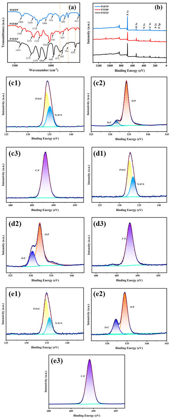 (a) FT-IR; (b) XPS; (c–e) High-resolution of XPS spectra; (c1–e1) P; (c2–e2) O; (c3–e3) F; (c) PTFEP/PVDF, (d) PTFBP/PVDF, and (e) POFPP/PVDF.