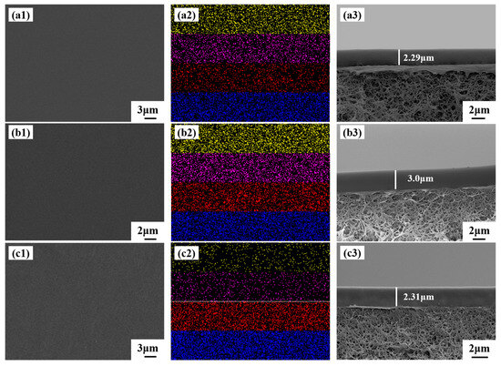 (a1–c1) Surface images, (a2–c2) mapping images, and (a3–c3) cross-sectional SEM images of membranes. P (yellow), O (pink), C(red), and F(blue). (a) PTFEP/PVDF, (b) PTFBP/PVDF, and (c) POFPP/PVDF.
