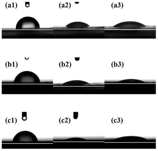 (a1–c1) Contact angle of water image, (a2–c2) contact angle of thiophene image, and (a3–c3) contact angle of n-heptane. (a) PTFEP, (b) PTFBP, and (c) POFPP.
