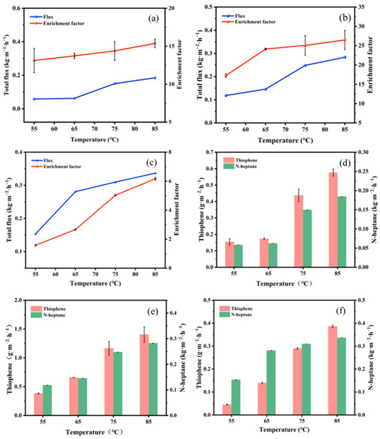 As illustrated in Figure 9a–c, the total flux and sulfur enrichment factor of PTFEP, PTFBP, and POFPP composite membranes exhibit an increasing tendency as the temperature rises. This can be attributed to the temperature elevation, which leads to a rise in the difference in partial pressure of components between the two sides of the membrane, thereby enhancing the driving force for transmembrane mass transfer, resulting in an augmented total flux [34]. The observed increase in the partial fluxes of thiophene and n-heptane in Figure 9d–f with temperature elevation further supports the aforementioned explanation.